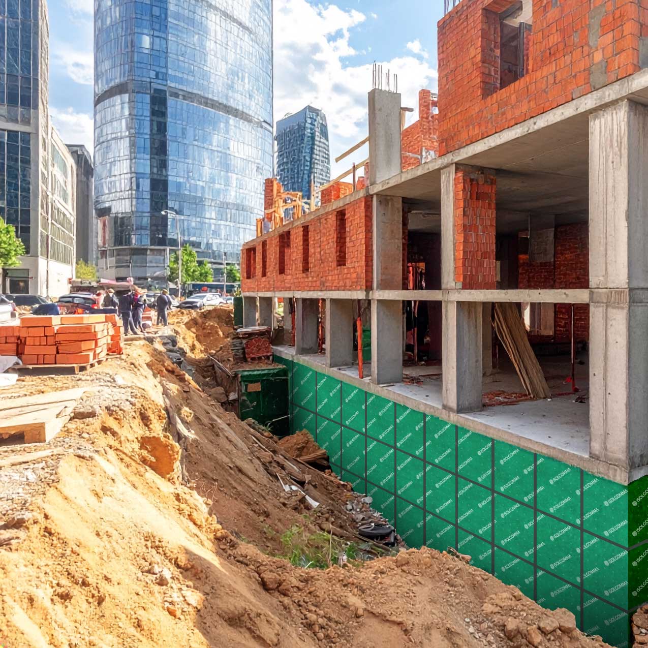 an elastic lining on the perimeter foundation walls to reduce external vibrations — suitable for both existing buildings and new construction.