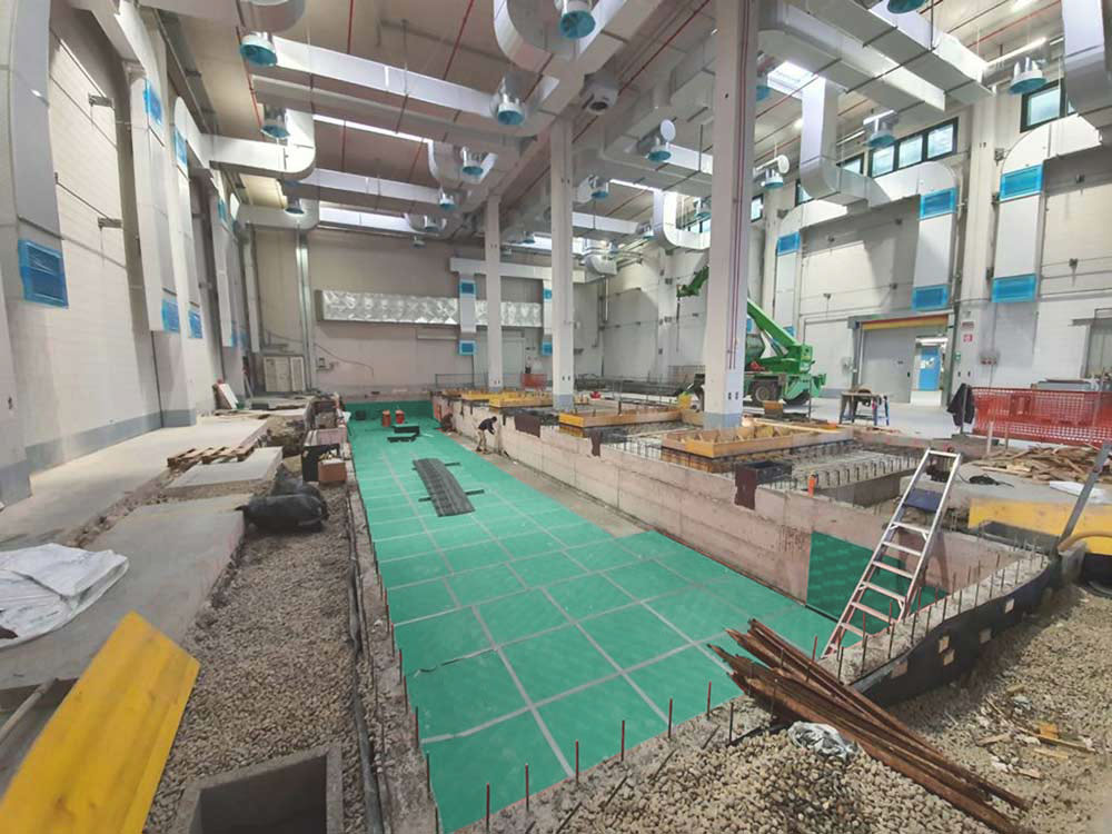 In order to meet the customer’s construction needs and the vibrational problems of the machines, an anti-vibration solution was proposed with Isolgomma panels installed in continuous underscreed. The use of MEGAMAT 25/500 and 50/500 combined together allowed to control the vibrations of the press.